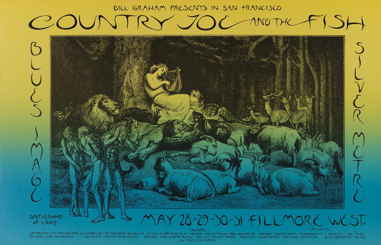 David Singer (American, born 1941). [Untitled] (Country Joe and the Fish...), 1970. Offset lithograph on paper, sheet: 14 x 21 5/8 in. (35.6 x 54.9 cm). Brooklyn Museum, Designated Purchase Fund, 73.39.230. ©Bill Graham Archives, LLC, www.Wolfgangsvault.com. (Photo: Brooklyn Museum)