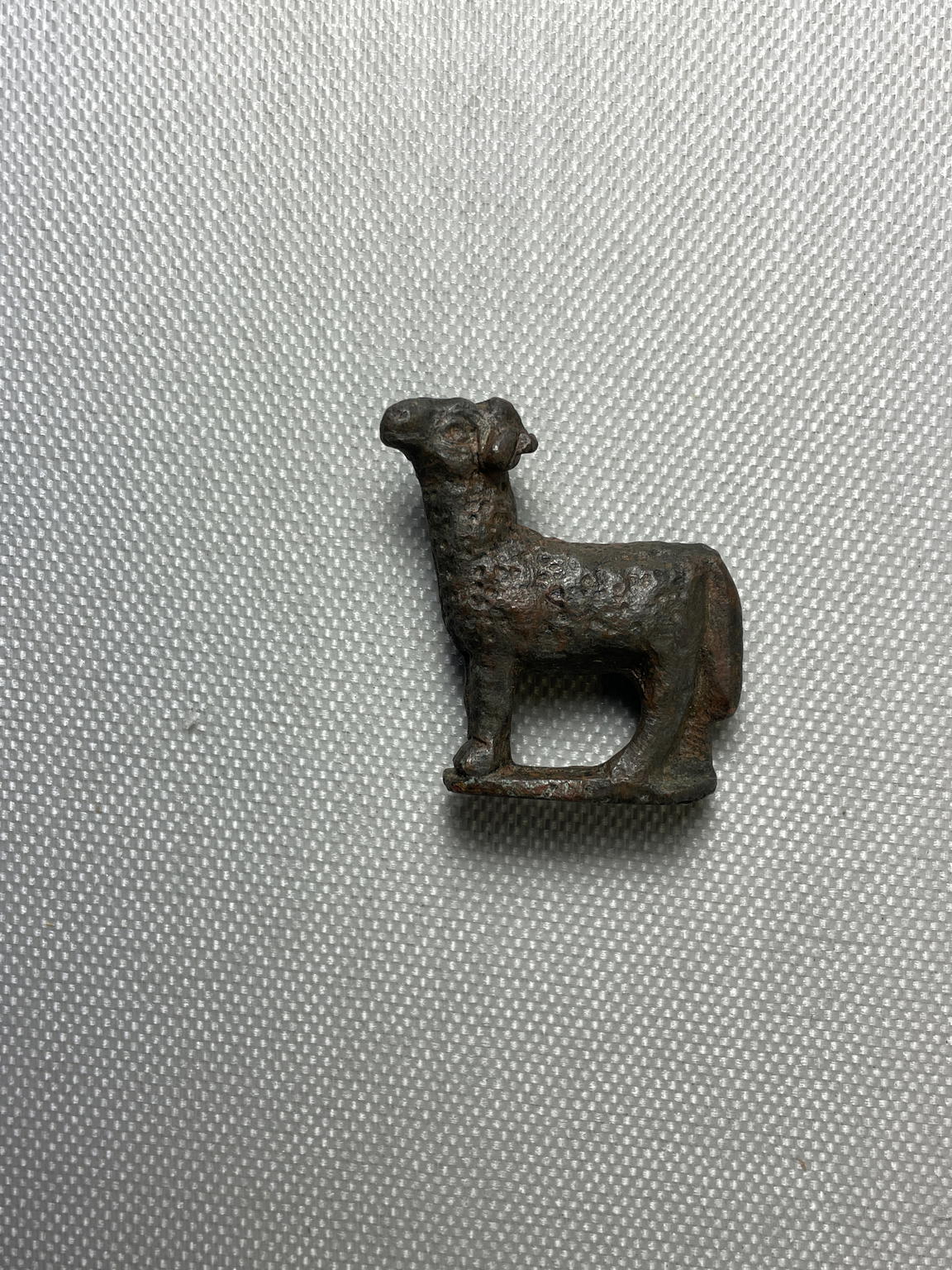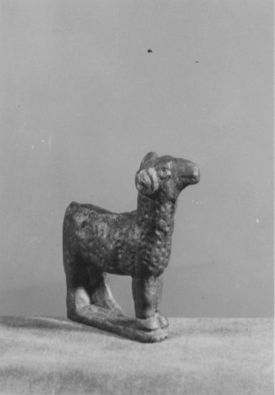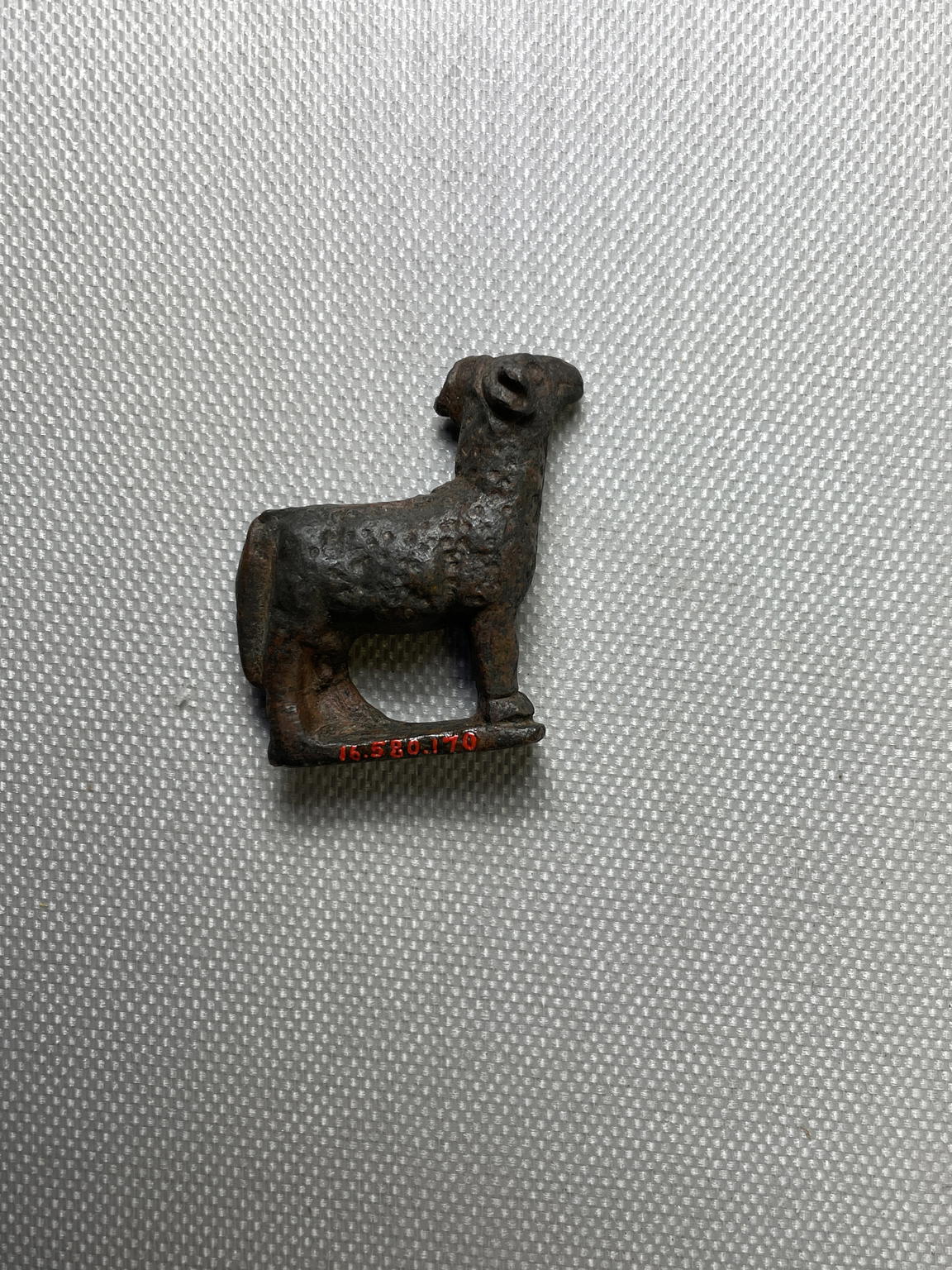 Miniature Figure of a Ram, 305 B.C.E.–395 C.E.. Bronze, 1 7/16 × 1 5/16 × 1/2 in. (3.7 × 3.3 × 1.2 cm). Brooklyn Museum, Gift of Evangeline Wilbour Blashfield, Theodora Wilbour, and Victor Wilbour honoring the wishes of their mother, Charlotte Beebe Wilbour, as a memorial to their father, Charles Edwin Wilbour, 16.580.170. (Photo: Brooklyn Museum)