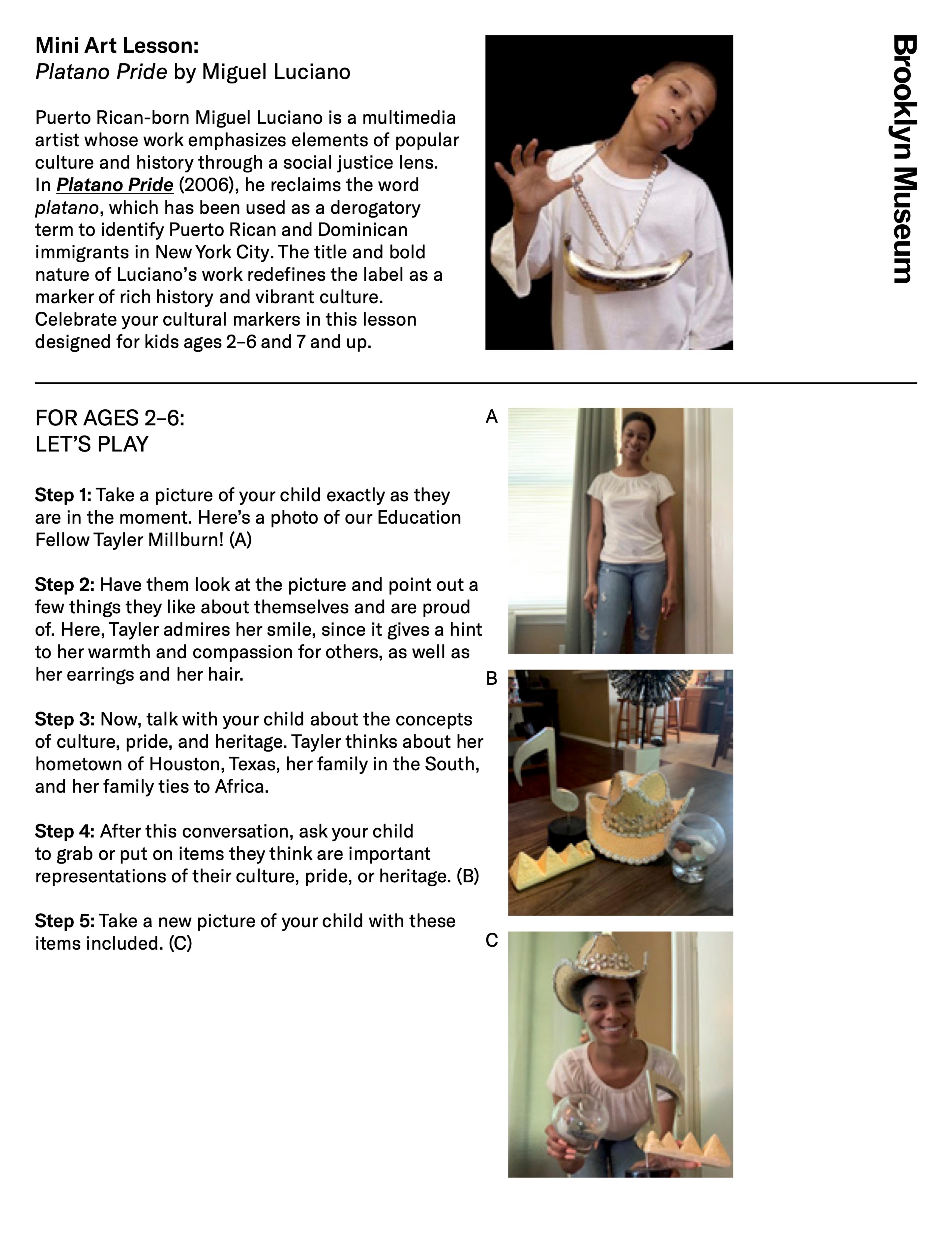 Puerto Rican-born Miguel Luciano is a multimedia artist whose work emphasizes elements of popular culture and history through a social justice lens. In Platano Pride (2006), he reclaims the word platano, which has been used as a derogatory term to identify Puerto Rican and Dominican immigrants in New York City. The title and bold nature of Luciano’s work redefines the label as a marker of rich history and vibrant culture. Celebrate your cultural markers in this lesson designed for kids ages 2–6 and 7 and up.